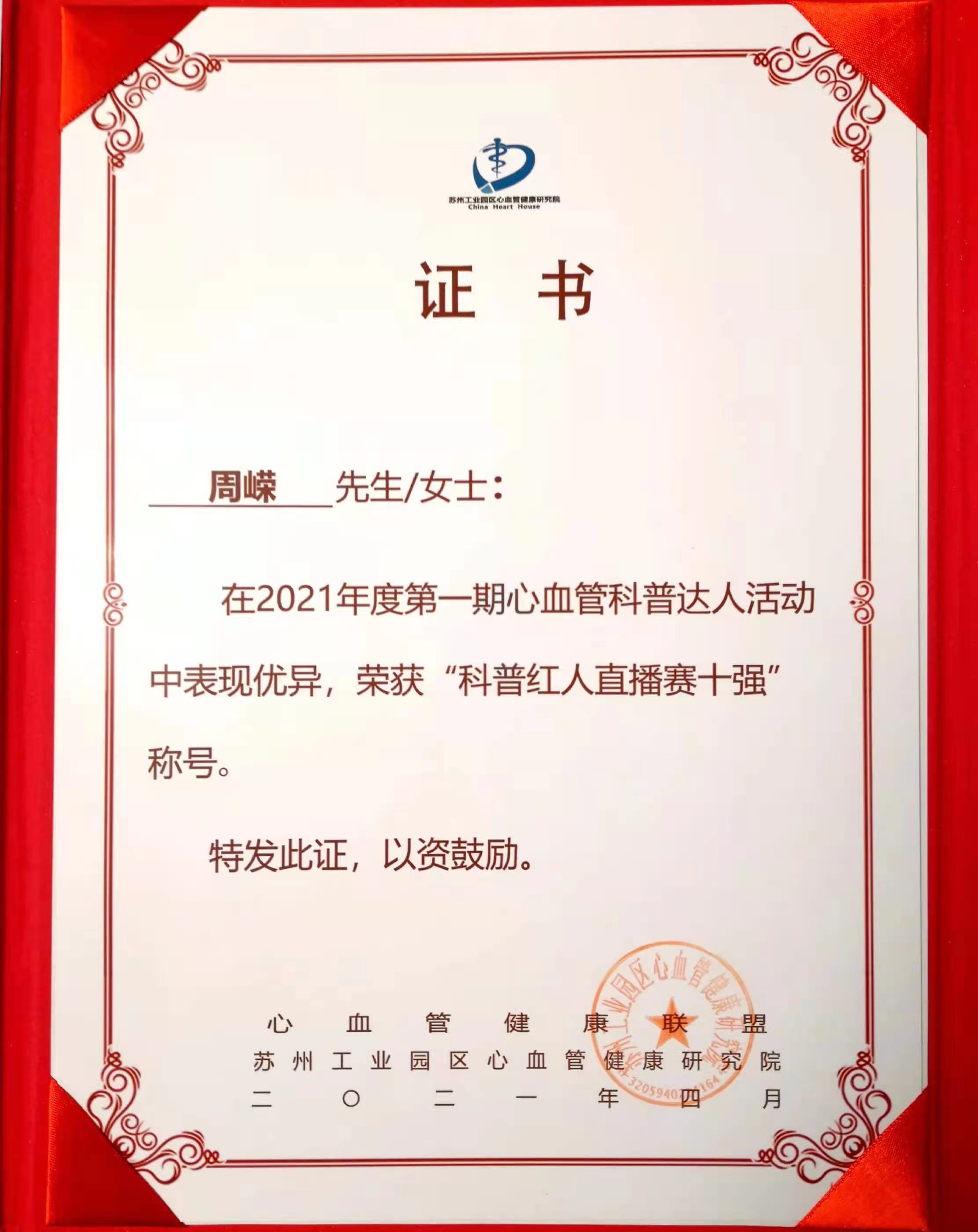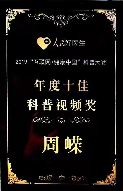 2021年 獲醫(yī)生云獎(jiǎng);獲“科普紅人直播賽十強(qiáng)”稱號(hào)
