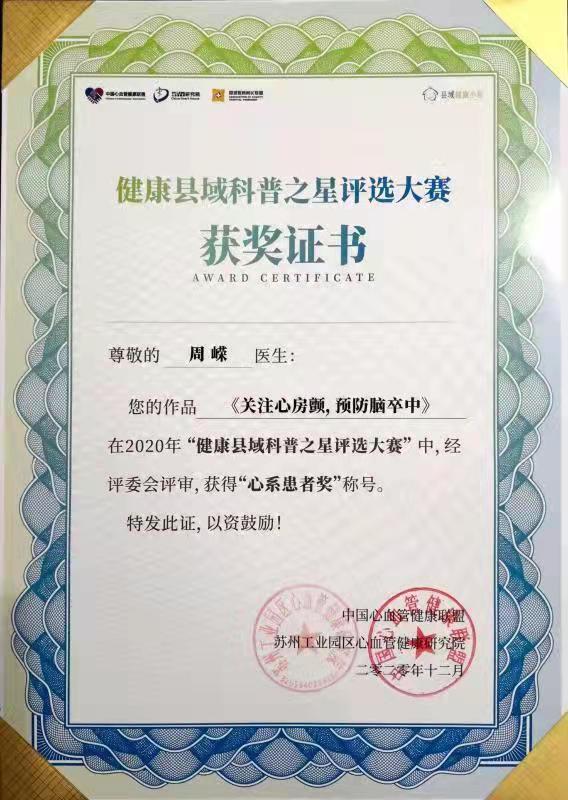 2020年 獲第二屆“互聯(lián)網(wǎng)+健康中國(guó)”科普大賽“科普達(dá)人獎(jiǎng)”
