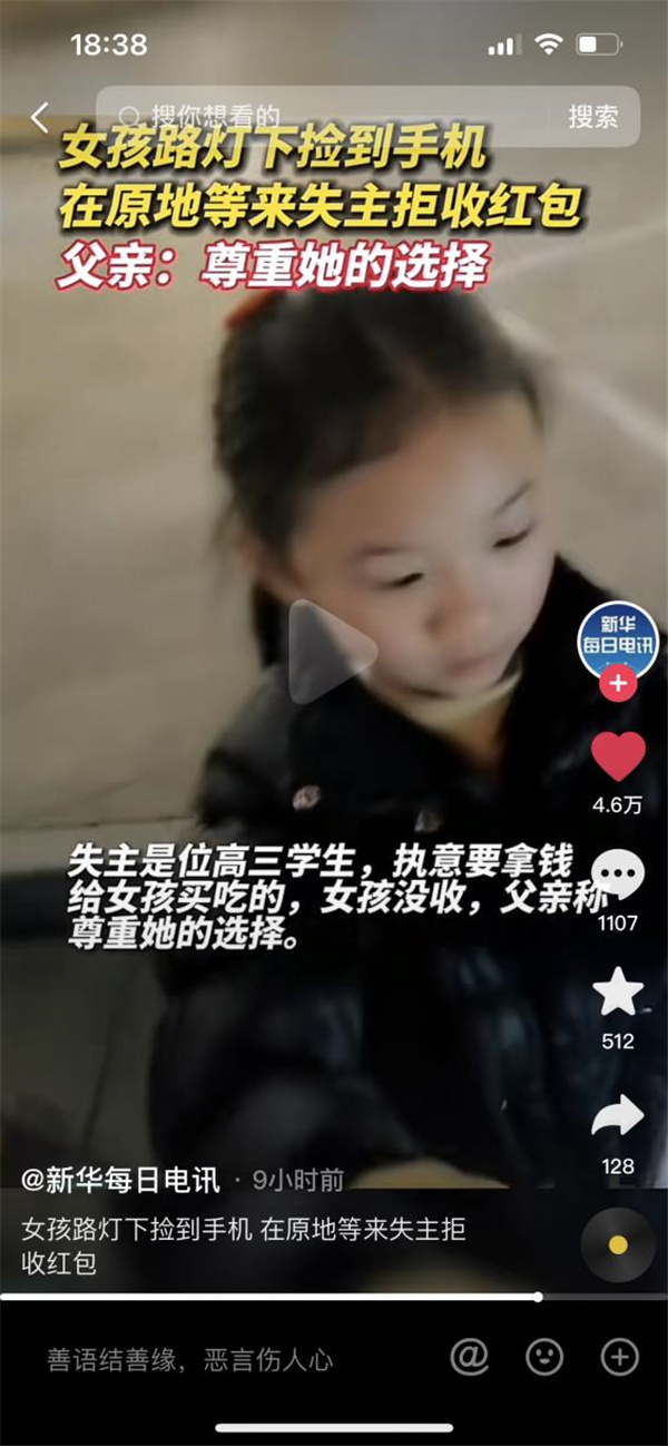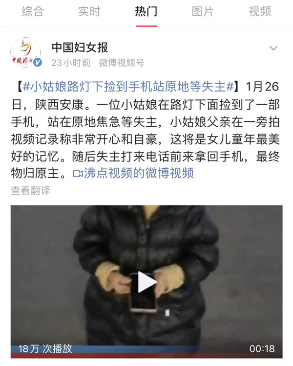1月28日下午,#女孩撿手機站原地等失主##小姑娘路燈下?lián)斓绞謾C站原地等失主#話題沖上了抖音熱門、微博熱門,廣大網友紛紛點贊。
