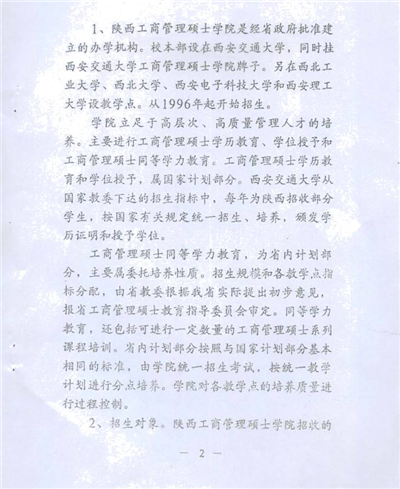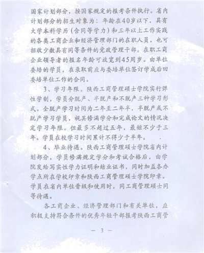 按照省政府有關(guān)文件規(guī)定,學(xué)員修滿規(guī)定的課程學(xué)分,完成畢業(yè)論文,通過論文答辯及評(píng)審后,由陜西工商管理碩士學(xué)院頒發(fā)畢業(yè)證書和學(xué)力證明。學(xué)員在省內(nèi)單位晉級(jí)和使用時(shí),視同工商管理碩士。