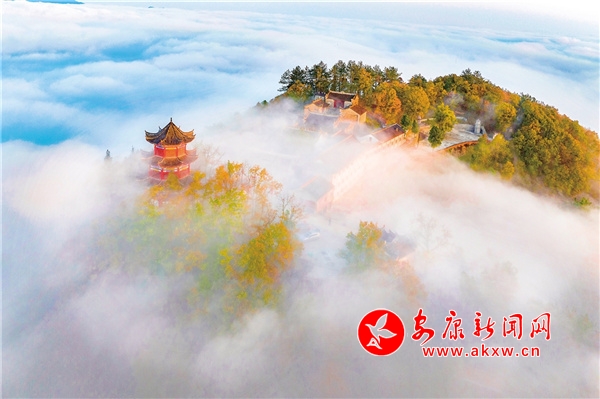 天柱山最美不過秋色,也是我在四季當(dāng)中頻繁上山的季節(jié)。每逢秋天,這里紅黃綠相間,漫山掛彩,在藍天的映襯下,多了幾分浪漫。從國道211起點的兩條上山公路,由數(shù)個“之”字連接起來,從湖邊一直盤旋至山頂?shù)陌自乒潘?,遠眺仿佛一個大大的“人”字形飄帶。雨后放晴的頭兩個早晨,在云霧的籠罩下,天柱山的下半身連同湖面一并被巨大的“蠶絲被”覆蓋,山的上半身或山頭浮在云海之上,像是茫茫大海上的一座孤島。