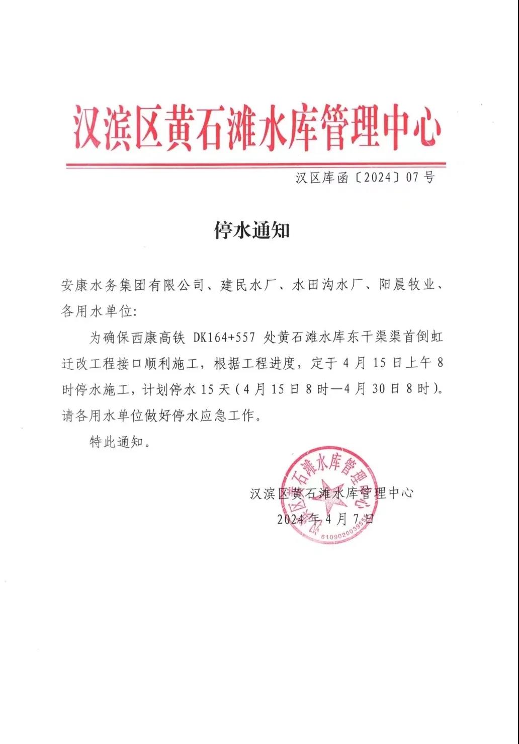 本網(wǎng)訊 4月12日,安康水務(wù)集團(tuán)有限公司供水分公司發(fā)布停水通知:因西康高鐵DK164+557處與黃石灘水庫東干渠渠首倒虹豎井正交,需對(duì)東干渠倒虹進(jìn)行遷改。根據(jù)遷改工程進(jìn)度和供水接口轉(zhuǎn)換施工需要,將于4月15日上午8時(shí)起對(duì)黃石灘水庫干渠進(jìn)行停水施工(工期15天)。