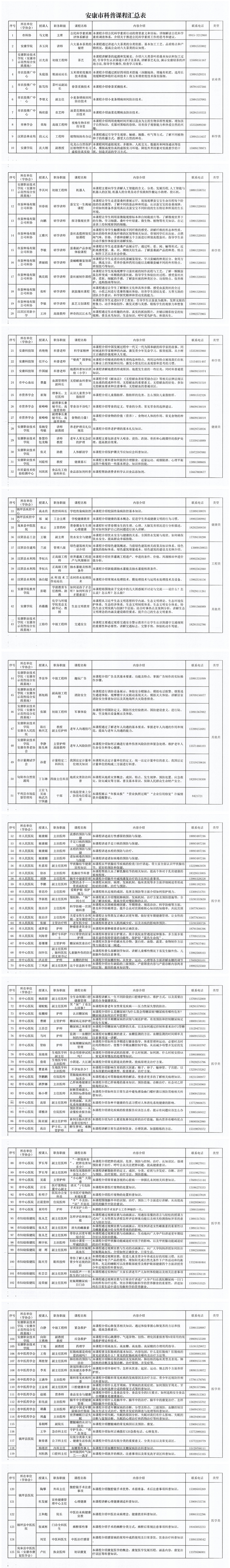 為認(rèn)真落實《安康市貫徹<全民科學(xué)素質(zhì)行動規(guī)劃綱要(2021-2035年)實施方案》,增強我市科普供給能力,助力提升全民科學(xué)素質(zhì),經(jīng)前期征集、審核整理,形成了安康市科普課程,共計125門課,內(nèi)容包括但不限于科學(xué)技術(shù)、農(nóng)業(yè)技術(shù)、工程技術(shù)、衛(wèi)生保健、生態(tài)環(huán)保、應(yīng)急處置、運動健康、生活常識、網(wǎng)絡(luò)安全等科普知識?,F(xiàn)將安康市科普課程予以公布,并就有關(guān)事項通知如下: