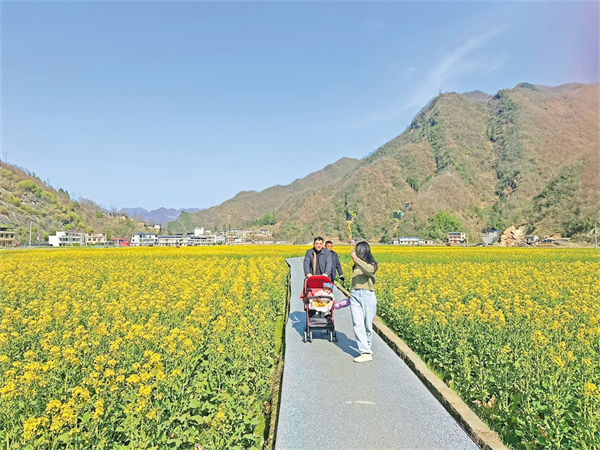 春暖花開,旬陽市仁河口鎮(zhèn)水泉坪千畝油菜花海競相綻放,慕名而來的游客們在觀光步道上觀光散步,三五伙伴一起拍照打卡、合唱民歌,欣賞高山出平川的獨特自然風(fēng)光。