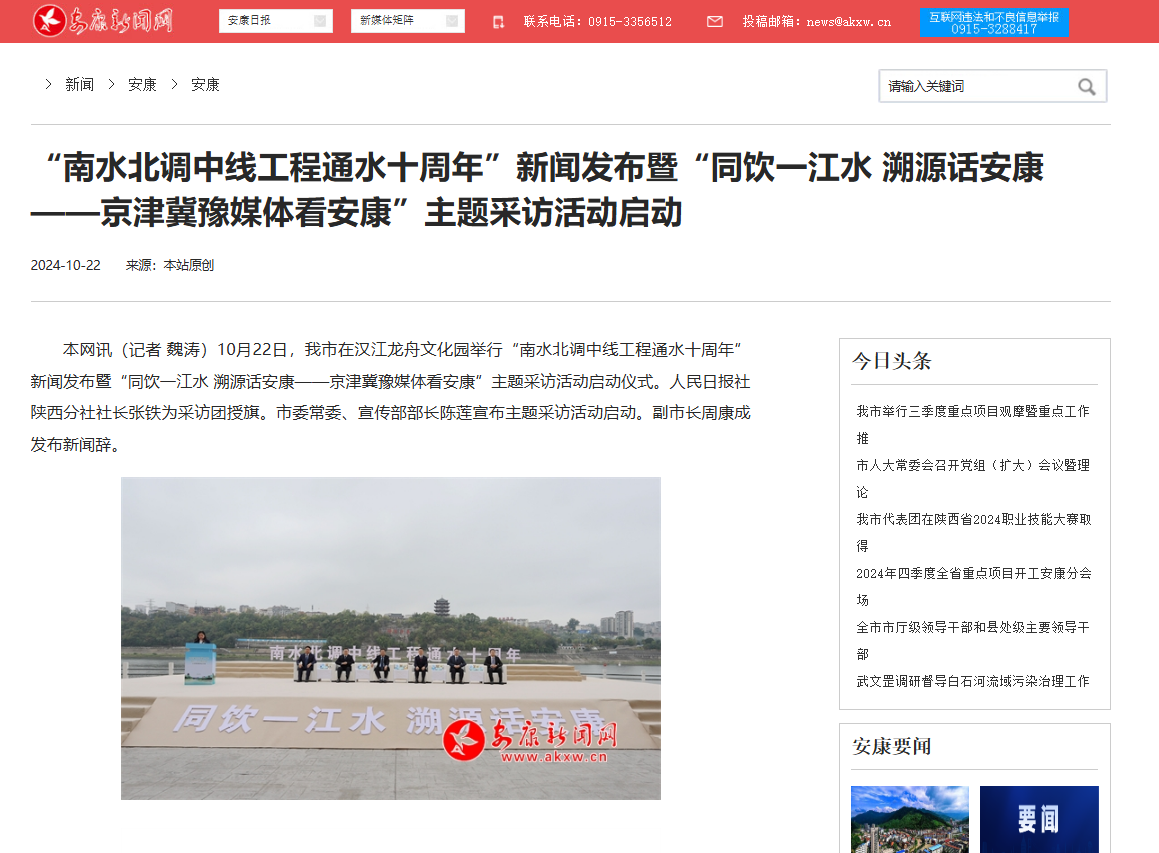 《“南水北調中線工程通水十周年”新聞發(fā)布暨“同飲一江水 溯源話安康——京津冀豫媒體看安康”主題采訪活動啟動》(2024-10-22發(fā)布)