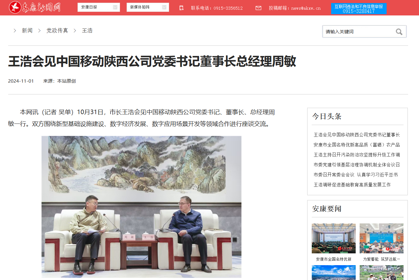 《王浩會見中國移動陜西公司黨委書記董事長總經理周敏》(2024-11-01發(fā)布)