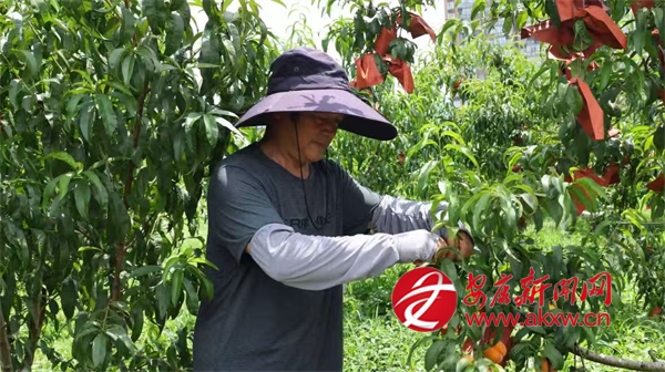 同樣迎來收獲的還有城關(guān)鎮(zhèn)的黃桃,在城關(guān)鎮(zhèn)龍嶺村的黃桃種植基地,連片的桃樹郁郁蔥蔥,金燦燦的黃桃壓彎了枝條,空氣中彌漫著誘人的桃香?;刎撠熑藙⒑暾χ烧樕涎笠缰鵂N爛的笑容,他一邊采摘一邊介紹道:“我們這個桃園有金鳳黃桃、黃金黃桃、秋彤桃和冬桃四個品種,一共有9畝多,從6月中旬到10月左右,陸續(xù)都有成熟的桃子?!?/p>
