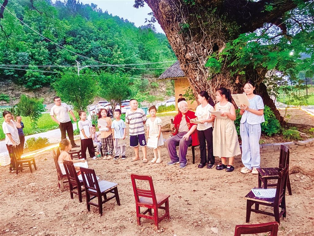 韓海燕(右四)在西河鎮(zhèn)磨溝村的古樹下給孩子們傳授國(guó)學(xué)知識(shí)