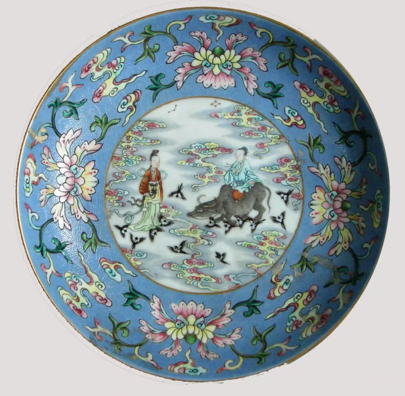 北京藝術(shù)博物館收藏的清代景德鎮(zhèn)官窯粉彩人物圖盤,就像一幅流動(dòng)的七夕畫卷。此盤工藝精湛,口沿涂金,熠熠生輝,盡顯皇家氣派。盤內(nèi)外壁采用“粉彩軋道”工藝,天藍(lán)釉地上淺淺的卷草紋似微風(fēng)輕拂,粉彩花卉與朵云紋相互映襯,如夢(mèng)如幻。盤內(nèi)底描金圓形開光處,粉彩繪就的人物故事圖案更為生動(dòng):牛郎坐于牛背,手握韁繩,深情凝望;織女身姿婀娜,嬌羞回望,二人似在互訴衷腸。背景中祥云繚繞、星辰閃爍、鵲鳥紛飛,為這場(chǎng)相會(huì)營(yíng)造了浪漫的氛圍。外底“鵲橋仙渡”四字,點(diǎn)明主題。