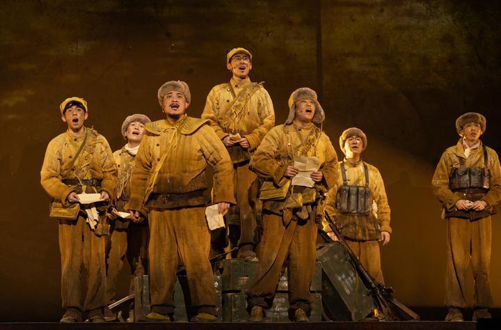 這是音樂劇《尋找李二狗》的演出劇照(2025年4月7日攝)。該劇以抗美援朝偉大歷史為背景,取材自志愿軍第39軍116師真實故事,通過當(dāng)代青年常衛(wèi)國借助爺爺?shù)幕貞涗洿┰交?950年鴨綠江畔的舞臺設(shè)定,展開兩代青年的跨時空對話。2025年11月,該劇榮獲第十八屆文華劇目獎。