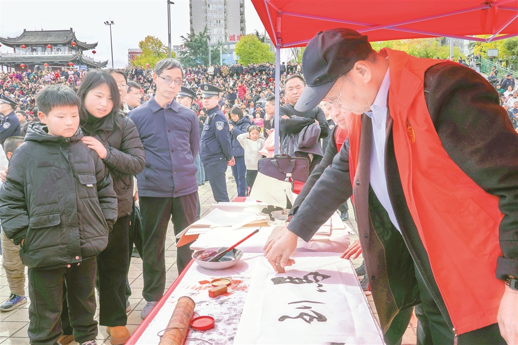 市集不僅有宣傳與服務(wù),更有可看可學(xué)的文明實(shí)踐?;顒?dòng)通過宣傳展板集中展示漢濱區(qū)移風(fēng)易俗成果與文明新風(fēng)先進(jìn)典型事跡,用身邊人、身邊事帶動(dòng)群眾。非遺代表性傳承人現(xiàn)場(chǎng)詮釋勤儉美德,書法愛好者現(xiàn)場(chǎng)書寫福字與家訓(xùn),讓群眾在傳統(tǒng)文化熏陶中,潛移默化地接受新風(fēng)教育。“非遺、書法和移風(fēng)易俗結(jié)合得好,孩子也能受教育。”帶著孩子逛市集的市民李女士收獲滿滿、笑意盈盈。