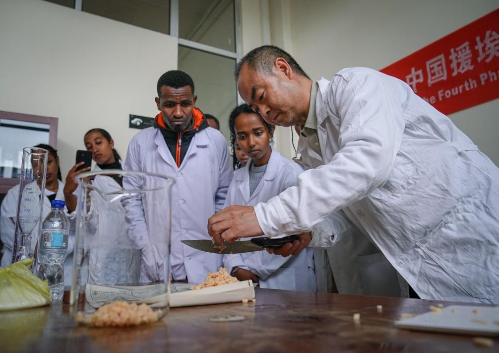 2025年8月20日,在埃塞俄比亞首都亞的斯亞貝巴,中方專家在亞的斯亞貝巴理工學(xué)院對大學(xué)生進行菌種制作技術(shù)指導(dǎo)。新華社記者 韓旭 攝