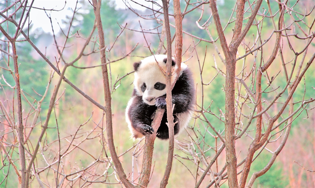 在樹上躲避天敵、等待母親歸來的大熊貓幼崽