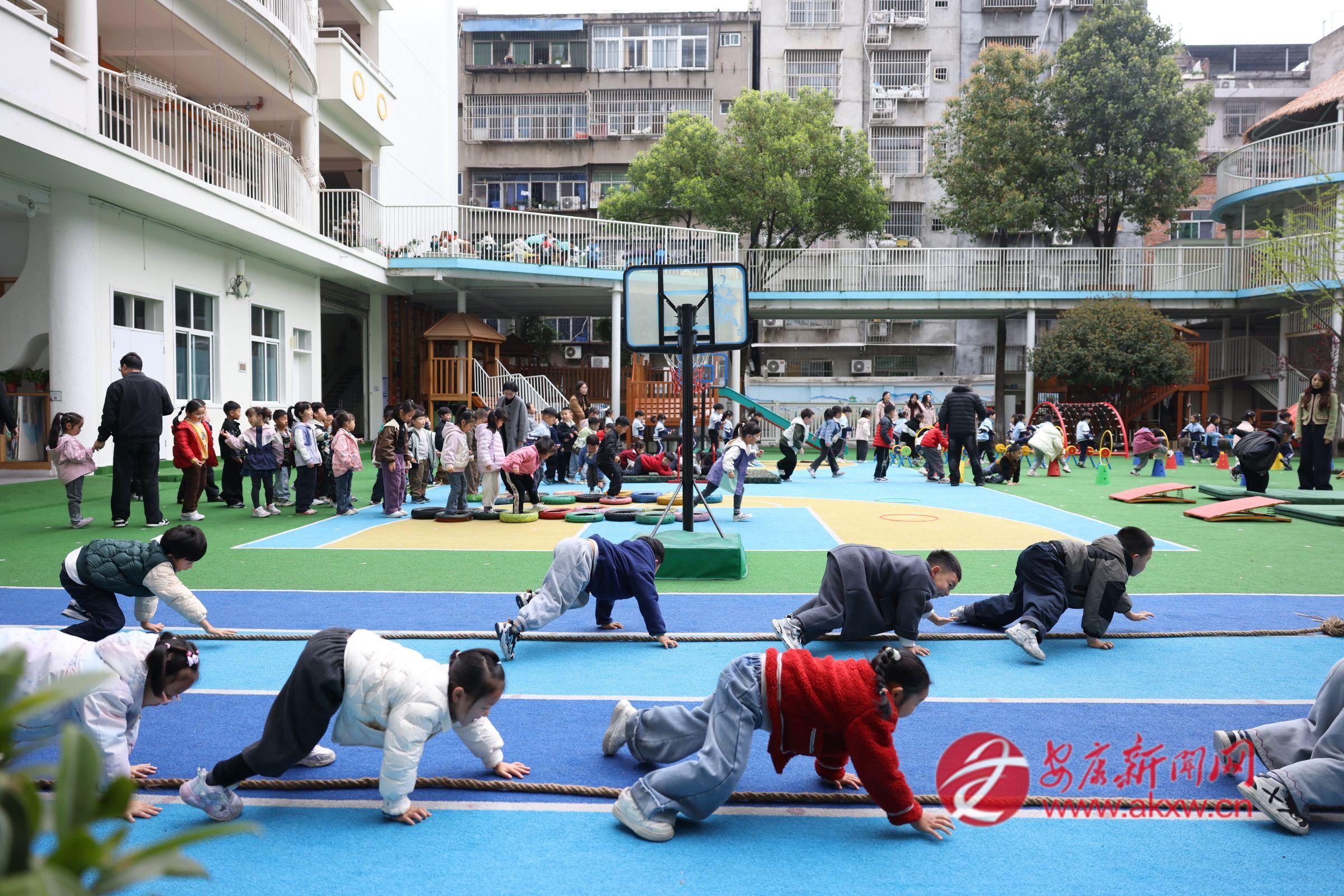安康市幼兒園教師每日開展晨間健身鍛煉,八段錦、籃球操、漢調(diào)二黃操常態(tài)化練習,嚴格落實幼兒每日兩小時戶外活動制度,科學統(tǒng)籌晨間鍛煉、體育游戲、餐后散步、戶外探索等環(huán)節(jié),常態(tài)化開展體育教學與體能大循環(huán)活動,通過攀爬、平衡、跑跳等趣味項目,全面提升幼兒身體協(xié)調(diào)性、靈活性與運動興趣。