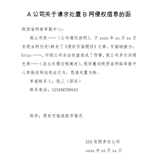 3.網(wǎng)絡(luò)侵權(quán)信息舉報請通過“侵權(quán)類”舉報入口提交,舉報人須實名舉報,同時必須提交請求維權(quán)處置函件和詳實的舉證材料。陜西省網(wǎng)絡(luò)舉報中心受理省內(nèi)各級政府組織、企事業(yè)單位和個人的互聯(lián)網(wǎng)侵權(quán)舉報,舉報行為執(zhí)行者須為政府、企事業(yè)單位等組織的責任部門或舉報主體本人,并清晰陳述侵權(quán)事實、侵權(quán)信息頁面鏈接、請求處置訴求等信息,舉證材料要盡可能詳實、完備。